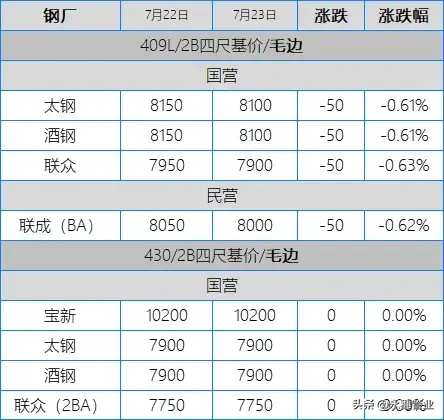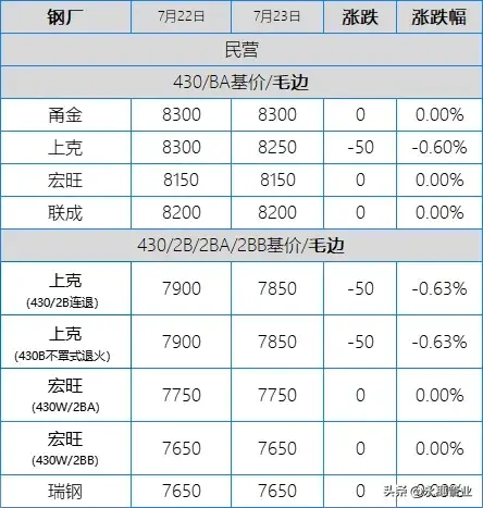 目前市場主流報價:410S熱軋黑皮在6100-6150元/噸;430熱軋黑皮在6700-6800元/噸;太鋼/酒鋼430/2B(毛)在7850-7950元/噸;聯(lián)眾430/2BA(毛)在7700-7800元/噸;宏旺430/2BA(毛)在7700-7800元/噸;甬金430/BA(毛)在8300元/噸左右;上克430/BA(毛)在8250元/噸左右;宏旺430/BA(毛)在8100-8200元/噸;瑞鋼430/2BA(毛)在7650-7700元/噸,其中期貨價在7800元/噸左右;聯(lián)成430/BA(毛)在8200元/噸左右。