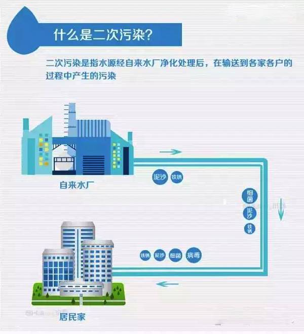 顧名思義,二次污染是指水源經(jīng)自來水廠凈化處理后,在輸送到各家各戶的過程中產(chǎn)生的污染。主要是一些水管老化出現(xiàn)的鐵銹、泥沙、細菌、病毒等雜質(zhì)和自來水廠氯制劑消毒后的副產(chǎn)物。二次污染的污染源主要有自來水管道、小區(qū)二次供水系統(tǒng)和水龍頭。