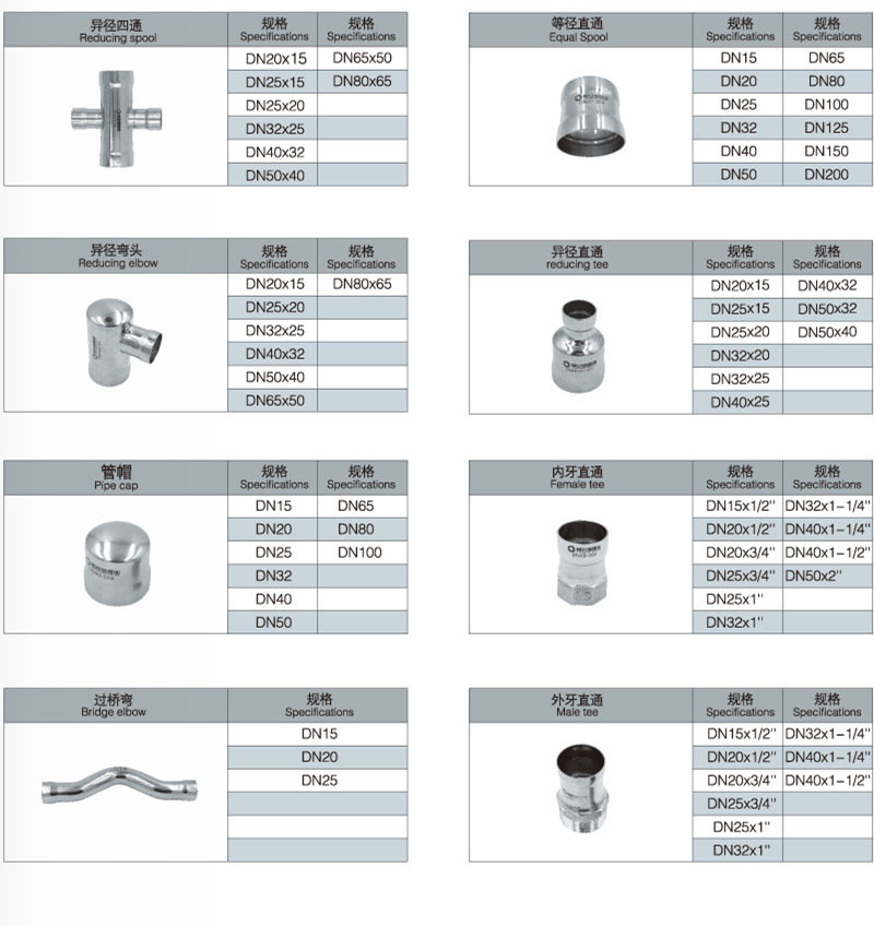 不銹鋼承插焊管件的品種包括:承插焊式45°等徑彎頭,承插焊式90°等徑彎頭,承插焊式180°等徑彎頭,承插焊式內(nèi)牙彎頭,承插焊式外牙彎頭,承插焊式異徑彎頭,承插焊式外牙三通,承插焊式內(nèi)牙三通,承插焊式等徑三通,承插焊式異徑中大三通,承插焊式異徑中小三通,承插焊式等徑四通,承插焊式異徑四通,承插焊式等徑直通,承插焊式異徑直通,承插焊式外牙直通,承插焊式內(nèi)牙直通,承插焊式過(guò)橋彎管,承插焊式管帽,承插焊式分水器等。